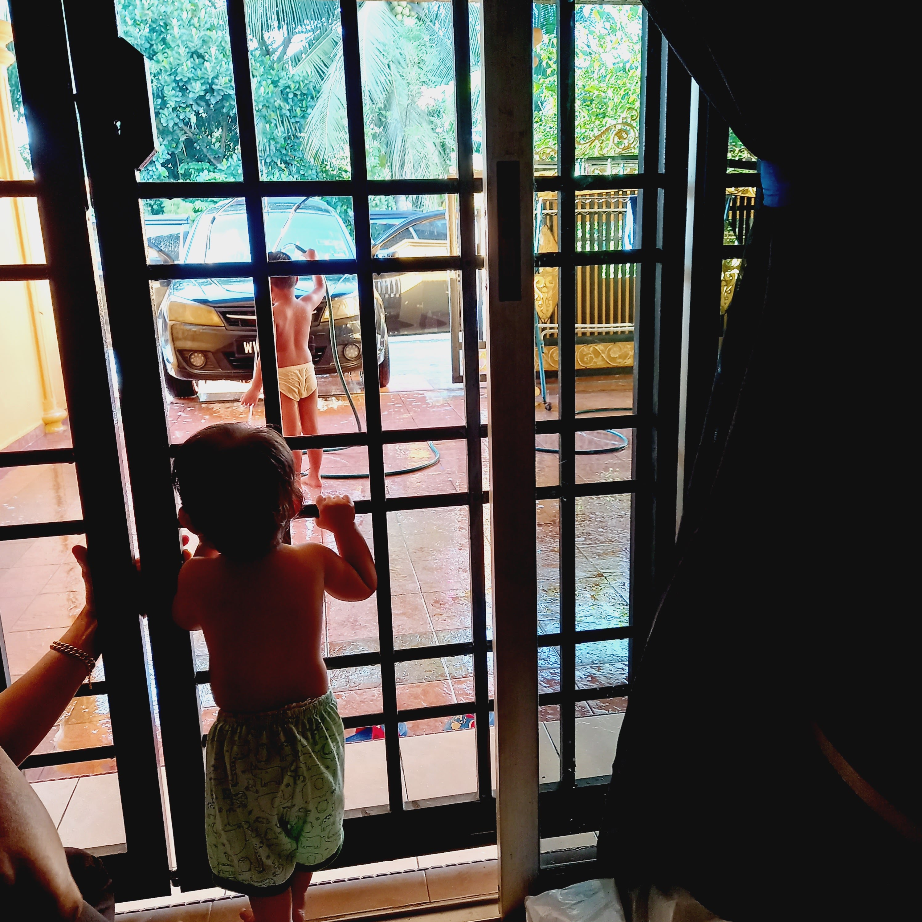 Balik dari makan abc, abah Ahnaff basuh kereta. Ahnaff pun ape lagi, peluang dia main air la. Tengok Sofea tu, duk berdiri kat grill sambil terjerit². 🤣